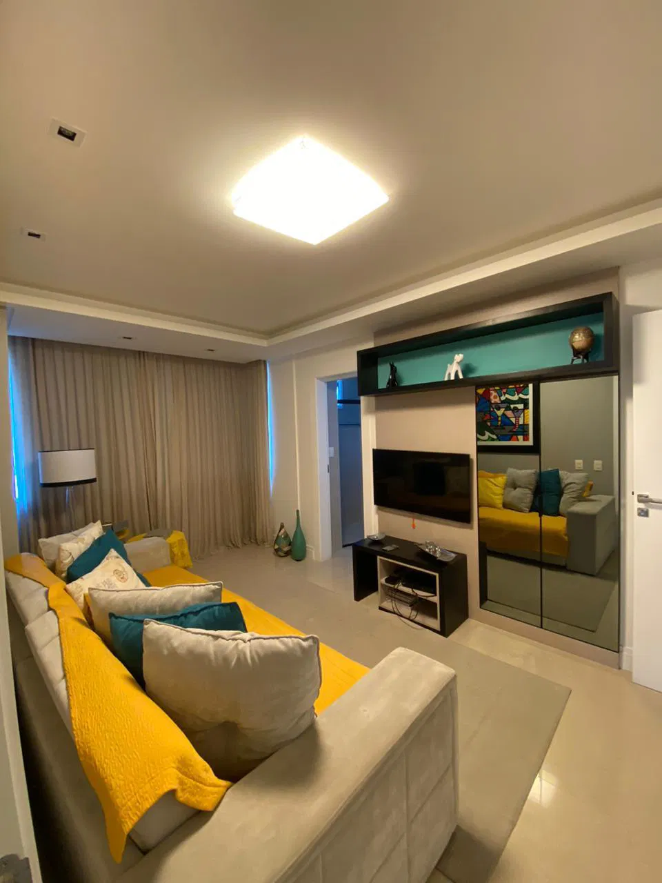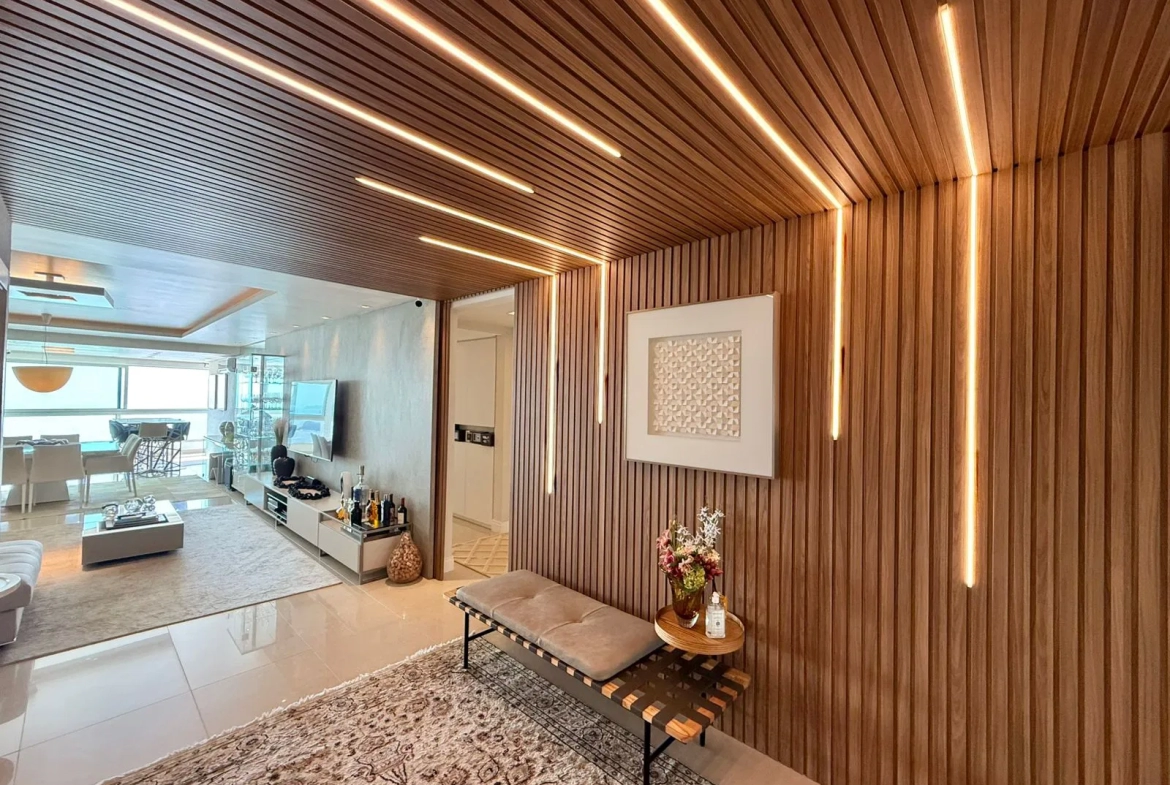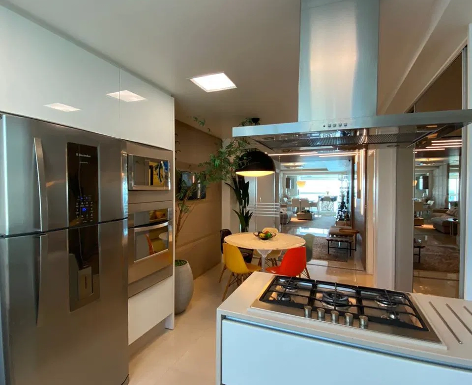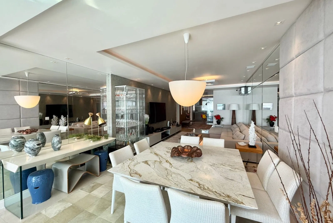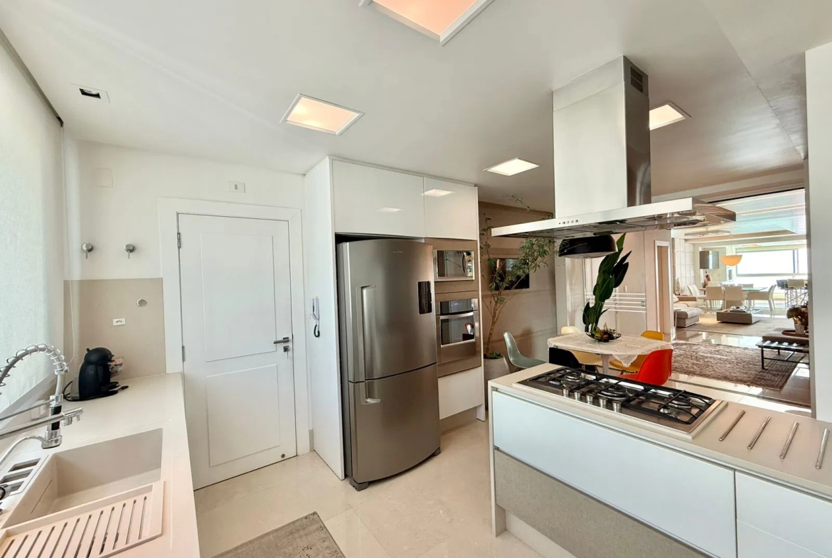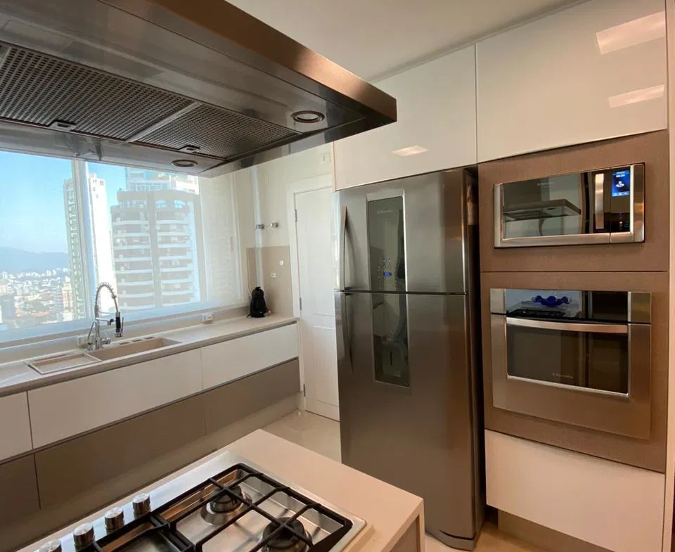 Apartamento em andar alto, com 4 suites, amplo living, churrasqueira, cozinha americana, varanda gourmet, móveis planejados e 3 vagas de garagem.