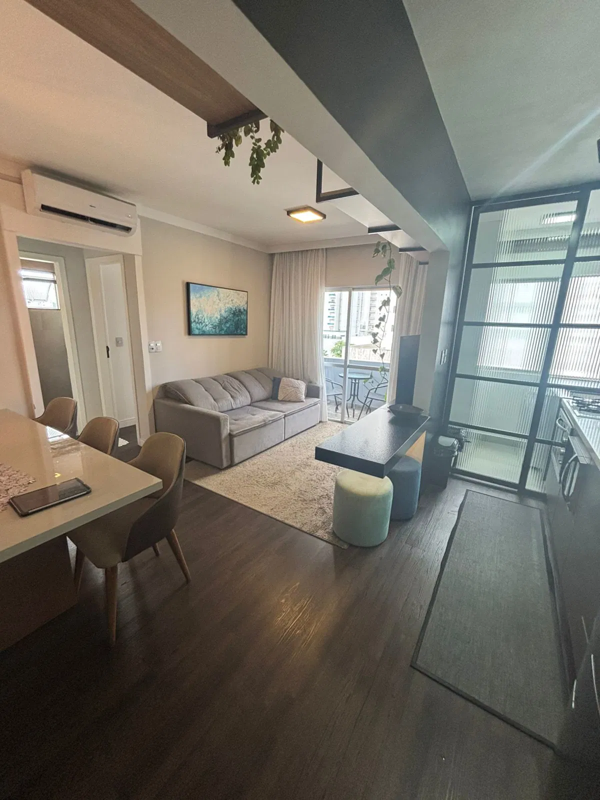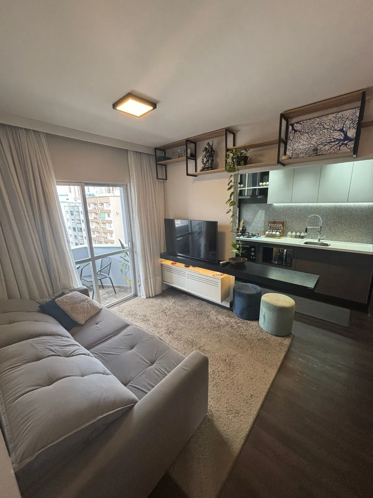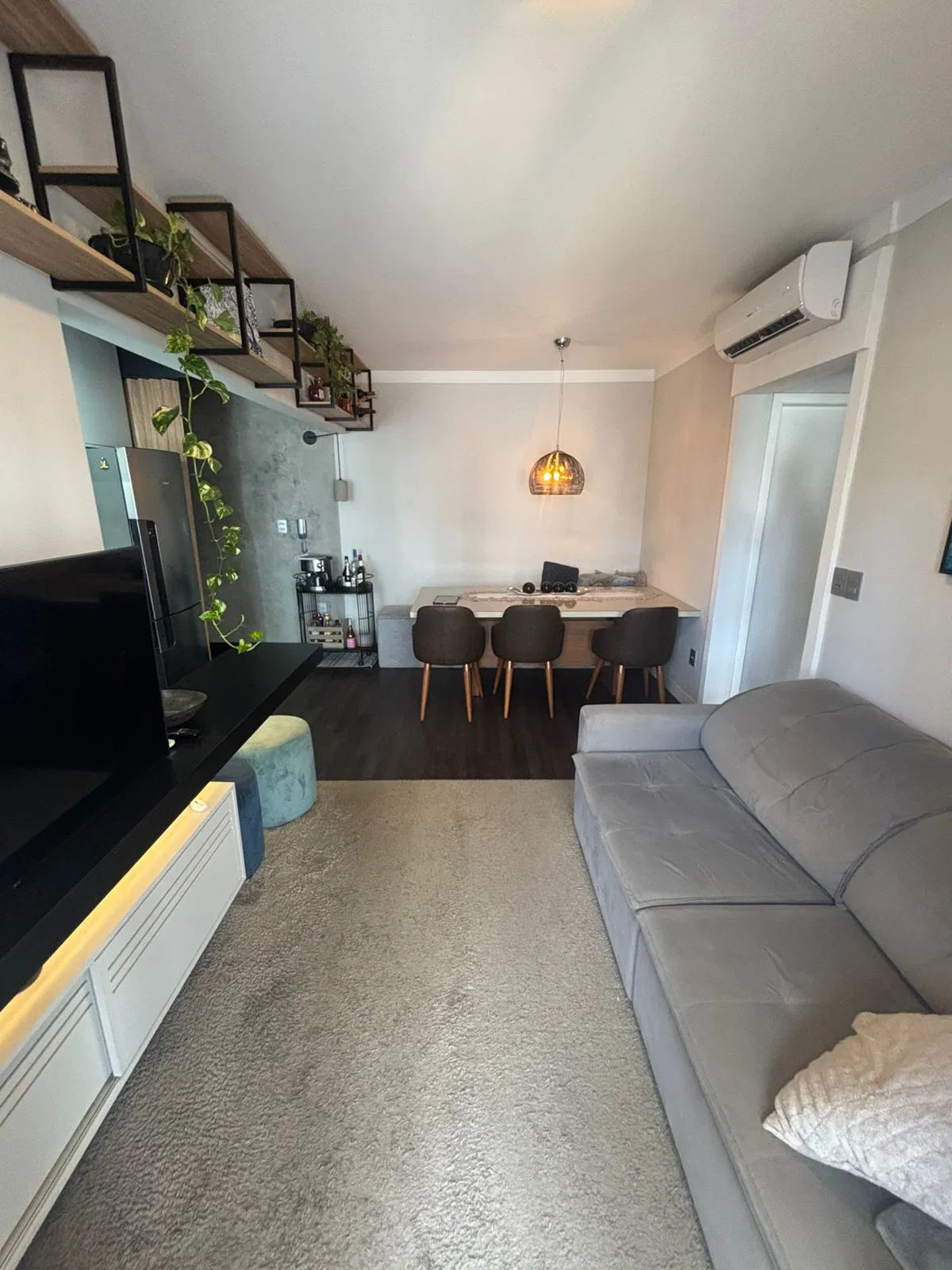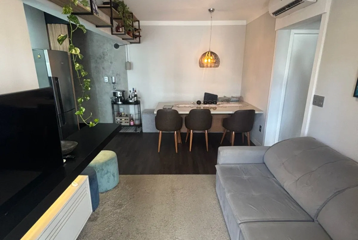 Apartamento mobiliado e decorado, com 2 dormitórios, piso em porcelanato, móveis planejados, sacada aberta e 1 vaga de garagem privativa.